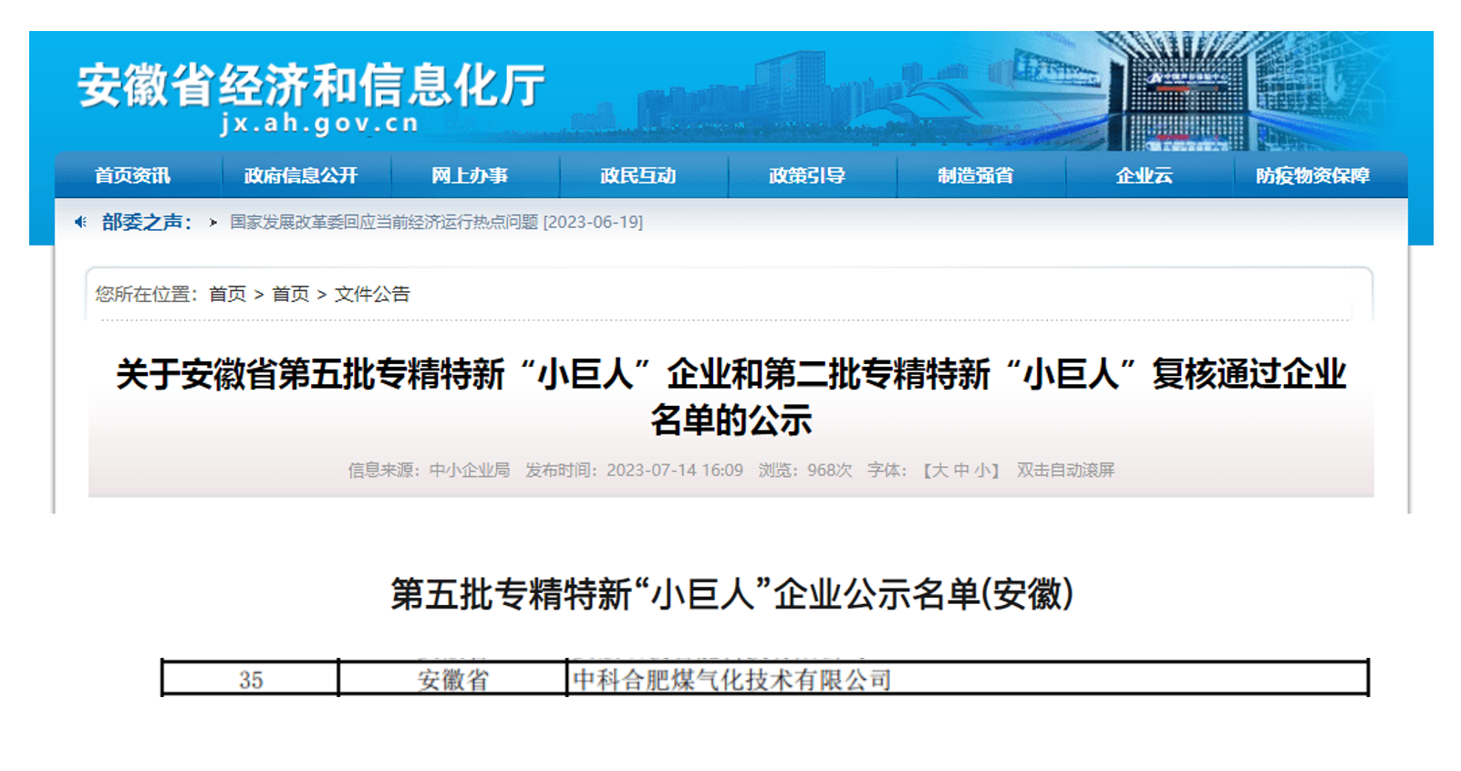 近日,第五批國家專精特新“小巨人”企業名單出爐,中科合肥煤氣化技術有限公司(以下簡稱“中合氣化”)通過市、省、工信部逐級評審后,最終榮獲工信部授予的第五批國家級專精特新“小巨人”稱號!這是中合氣化繼2020年榮獲省級和市級“專精特新中小企業”的又一重要里程碑,公司的專業水平與創新能力得到進一步認可。