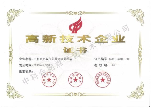 2019年,中合氣化獲得由安徽省科學技術廳、安徽省財政廳、國家稅務總局安徽省稅務局聯合頒發 “國家級高新技術企業”證書,正式加入國家高新技術企業行列。該榮譽將進一步推動公司自主創新、自主研發的進程,也為中合氣化今后加大技術創新力度,提高科技研發實力提供了根本保證。